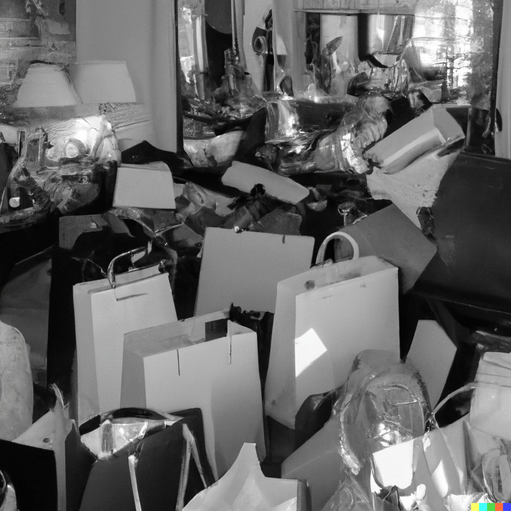 Despite the house’s beauty, every room was buried in clutter. Full shopping bags squatted on every surface, even the floor. When you walked into a room, you shuffled your feet forward, brushing the shopping bags aside like stalks of wheat or corn. It was madness.